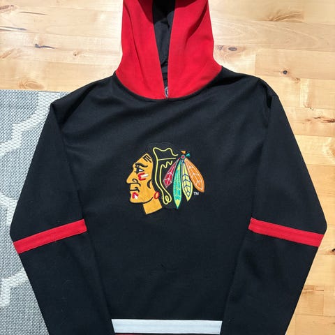 NHL-BLACKHAWKS FANIHUPPARI CCM Pro OKO jääkiekko huppari punaisena, jossa mustat ja valkoiset raidat hihoissa. Hupparissa on nyöritys kauluksessa ja edessä iso tasku. Materiaali ei ole määritelty, mutta huppari on tarkoitettu jääkiekkoiluun.