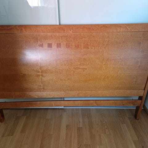 Sängynpääty Brimnes. Pääty lepää omalla painollaan seinää vasten. Molemmissa päädyissä kolme hyllyä, päällä 28 cm leveä taso esim. lampuille. Leveys parisängylle. Annetaan muuton alta tarpeettomana.