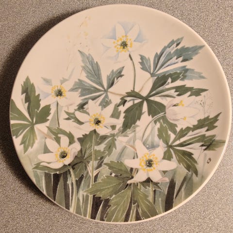 Suomen Kotien Kukkarahasto Valkovuokko seinälautanen, koko 19,7cm. . Suunnittelija Kirsti Brandt, valmistettu Arabialla. Lautasessa on ripustuslenkki seinälle kiinnittämistä varten.