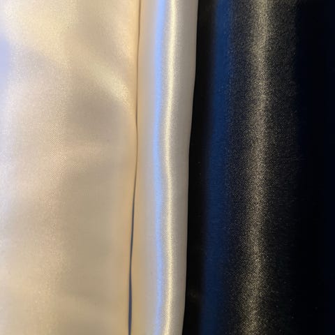 Satiinikankaita luonnonvalkoinn (1,5m x 16m)ja valkoinen (1,5m x 14,5m). Satiinikankaissa on kaunis kiiltävä pinta. Hinta 45 €/luonnonvalkoinen ja 45€/valkoinen