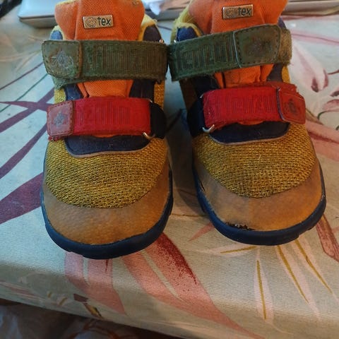 Käytetyt, mutta yhä asiansa ajavat vk-paljasjalkakengät. Pientä kulumaa ja pintalikaa löytyy.