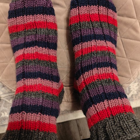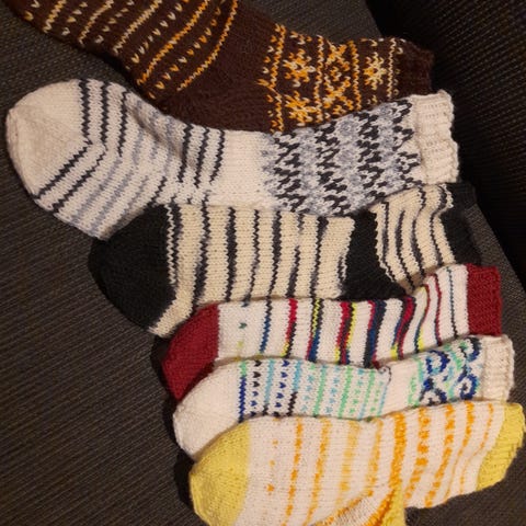 Kolme paria käsin neulottuja villasukkia. Sukkien koko noin 32.