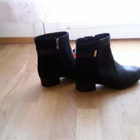 Naisten saappaat, koko 37. Merkki Fuzz, varmaan keinonahkaa, vuori tekstiiliä. Varren korkeus korolla 44 cm. Sisäsivulla vetoketju ja ulkosivulla ylhäällä varressa joustavaa neulosta.