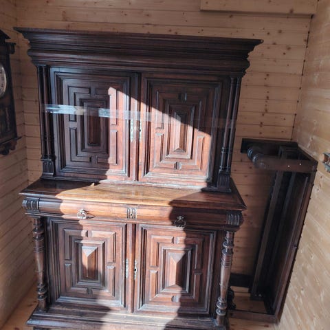 Antiikkityylinen puinen kaappi koristeellisilla yksityiskohdilla