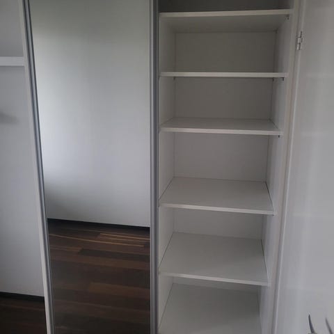 Valkoisella rungolla ja kahdella liukupeiliovella varustettu kaappi