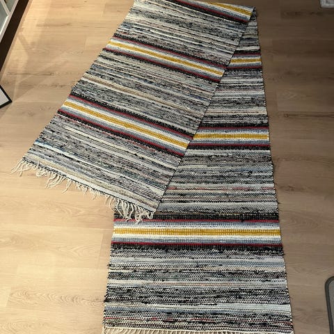 Hyvässä kunnossa iso räsymatto uuteen kotiin. Ei purkaumia tai repeämiä. Mitat ovat 120 x 250 cm.