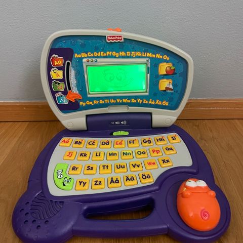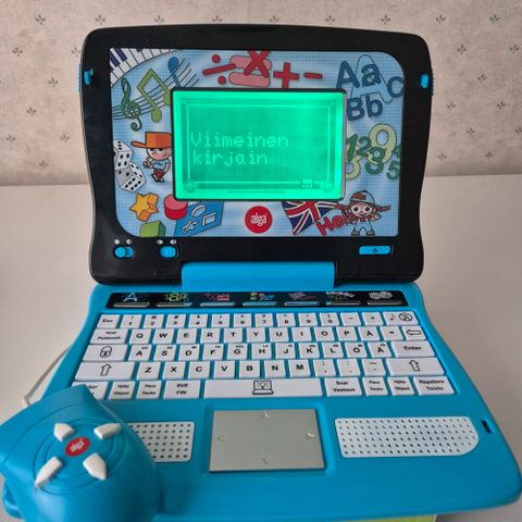 Lasten puinen tietokone, jossa mukana magneetteja. Näyttöön voi kirjoittaa liidulla ja magneetin pysyvät näytössä. Melkein kaikki osat tallessa.