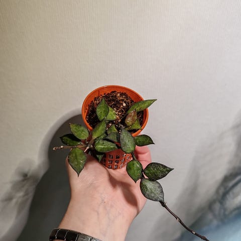 Hoya pubicalyx silver spot/silver splash eli posliinikukka. Istutettuna multaan, noin 10cm halkaisiljaltaan kokoiseen ruukkuun. Helppo hoitoinen.