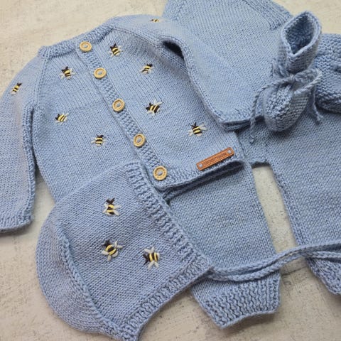 Itse neulottu uusi vauvan neuletakki, neulemyssy sekä kaulaliina ja tossut.