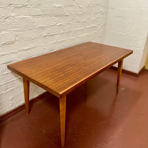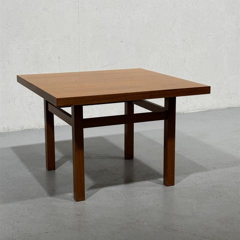 50-luvun Teak viiluinen sohvapöytä 80x80 cm, korkeus 50 cm. Hyvä kuntoinen. Kuljetus järjestyy