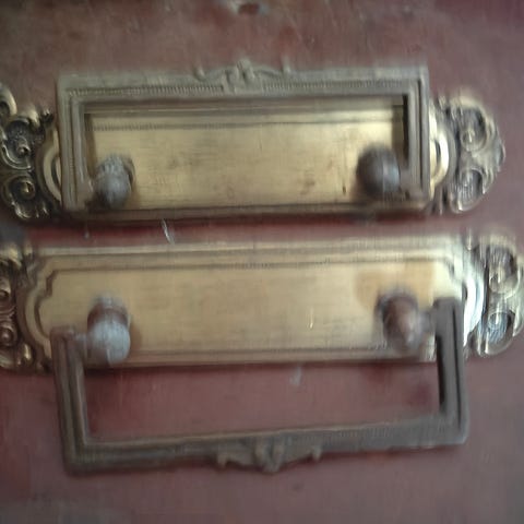 Antiikkinen vanha kaunis ovenkolkutin. Pituus 29.5 cm, leveys leveältä kohdin 4,7 cm.