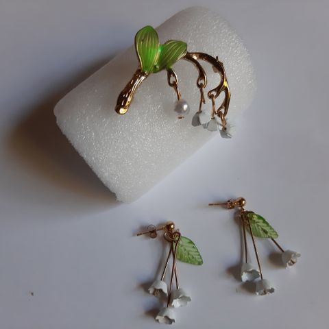 Rintakoru ja Korvakorut Kielot kullanväriset, kukat emaloidut. Rintakoru pituus 4 cm. Korvakorut nasta malli pituus 35 mm molemmat käyttämättömät kysy lisää kulkeutuu sovittaessa lähialueelle + postitus yht 25 €