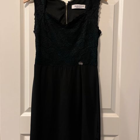 Kimalteleva, musta juhlamekko puolikorkealla kauluksella, takana halkio, alla mukava alushame, eli ei näy mitään läpi. Merkki: ICHI.