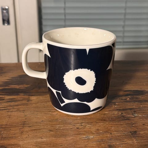 Marimekko Kestit muki, jossa on kukkakuviointi. Materiaali posliinia, väriltään valkoinen ja pinkki.