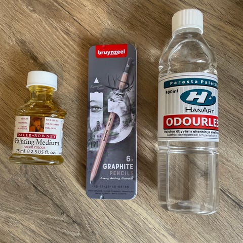 Kynä tekstaukseen kahdella kolmella eri päällä +musteet mukaan. Sisällä oleva lienee kuivunut ja vaatii veden kautta viruttamista, ellei ole jo loppu. Mukaan myös edelleen kosteana pysynyt, ei kovin vanha, musta tekstaussivellin.