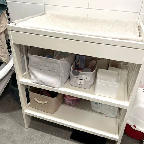 IKEA Gulliver lastenhoitopöytä. Mukaan hoitoalusta ja toisen kuvan säilytystelineet. Käytön jälkiä, mutta täysin ehjä ja hyvässä kunnossa. Tarran saa poistettua halutessaan. Ei ole häirinnyt meitä.