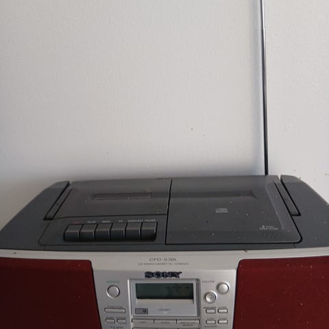 Myydään näppärä yhdistelmälaite. Tässä on kasetti ja cd-soittimet sekä radio. Kaiuttimien verhoilu irrotettavissa. Verhoilut ja pinnat ehjät.