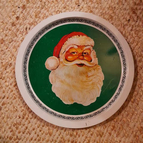 Kaunis joulutarjotin. Halkaisija n. 33 cm. Kuvitus Marja-Liisa Pitkäranta. Peltiä. muutama naarmu takana