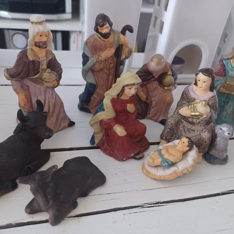 Myydään kaunis ja perinteinen 5-osainen jouluprespio. Settiin kuuluu Maria, Joosef, Jeesus-lapsi, härkä ja aasi.