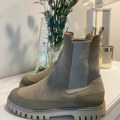 Muutaman kerran käytetyt Tommy Hilfigerin nilkkurit, koko 39 ja materiaali nahka. En voi itse käyttää oheisia kenkiä, koska toinen jalkani on hieman isompi kuin toinen ja kenkä on pienempään jalkaani liian tiukka. Mukana tulee beiget kenkien varanauhat.
