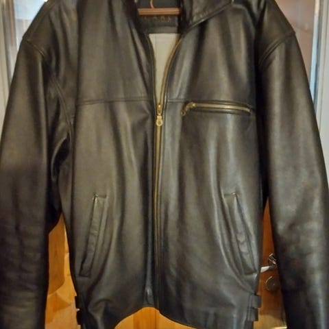 Miesten musta nahkatakki. Hihassa muutama kissan raapimisjälki, siksi halpa hinta. Kuva 3.