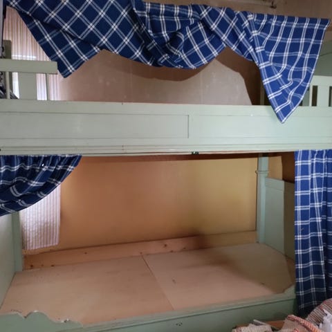 Valkoinen muuramen kerrosänky+ sängyn alle pyörillä työnnettävä varasänky. Se on nimeltään Viesrasvara. Sängyssä on kolhua ja tikkaista puuttuu yksi porras.