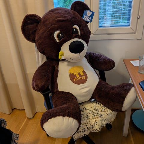 Suuri kokoinen pehmolelu vielä pukinkonttiin, ruskea väri, pehmeä materiaali. Sopii lasten leikkeihin ja koristeeksi.