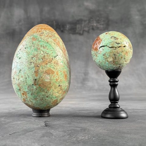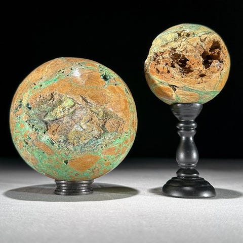 Upea pari vihreitä smithsonite-palloja räätälöidyillä jalustoilla.