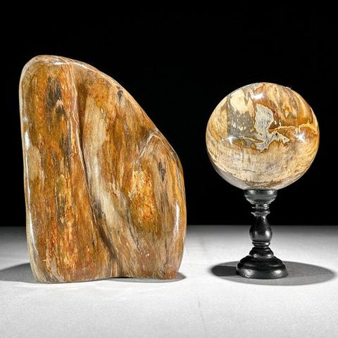 Upea kiillotettu petrifioitunut puusphere jalustalla ja vapaamuotoisena.