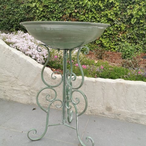 Tämä on ihastuttava seisova lintukylpyamme. Siinä on takorautainen jalusta, kaunis suuri allas ja kaksi koristelintua. Mitat ovat seuraavat (noin):