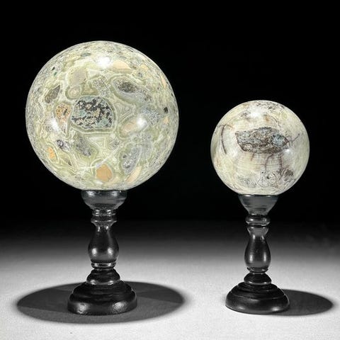 Upea setti kolmesta kiillotetusta Onyx-kivipallosta räätälöidyissä jalustoissa.