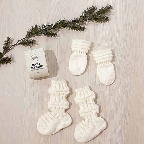 Dropsin baby merino -langasta neulotut villasukat (raidalliset + junasukat) ja lapaset vauvalle. Väri punainen / punavalkoraidallinen.