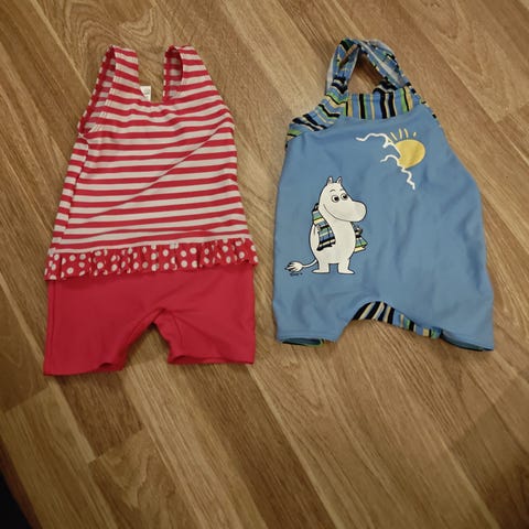 Vauvan uimahousut (koko M helposti säädettävissä) ja painijamallinen uimapuku (kokomerkintä 70). UV-suojallinen.