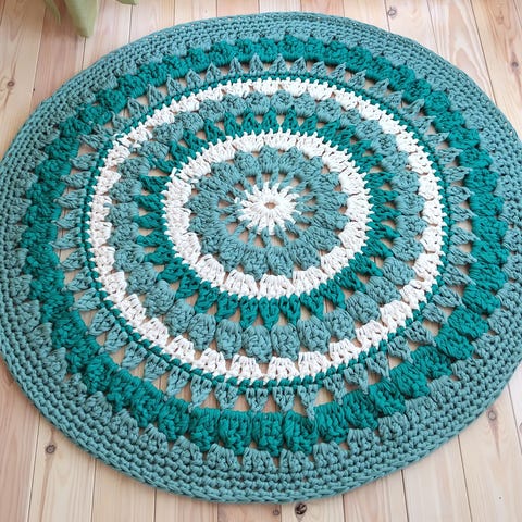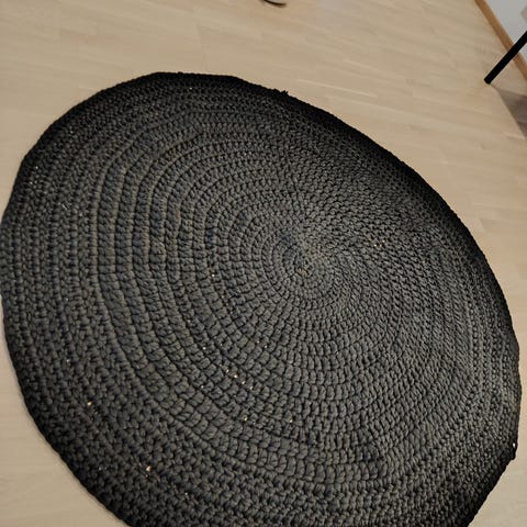 Käsin virkattu pyöreä matto.