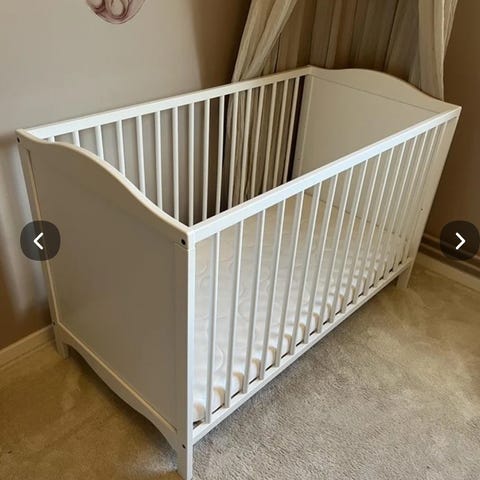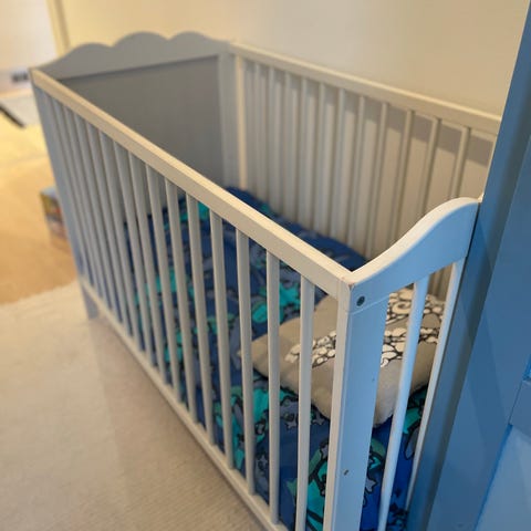 Pinnasänky valkoisesta puusta. Sänky soveltuu pienille lapsille ja tarjoaa turvallisen nukkumapaikan. Huomioi käytön jälkeiset kulumajäljet ja pienet vauriot näkyvissä kuvissa.