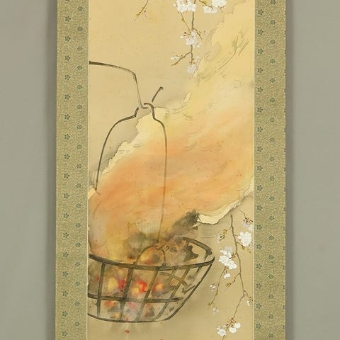 Tämä vaikuttava roikkuva scrolli vangitsee dynaamisen vuorovaikutuksen kirkkaan punaisen auringon ja vyöryvien meren aaltojen välillä, toteutettuna rohkealla mutta harmonisella sivellustyylillä. Auringonnousu — kestävä symboli elinvoimasta, uudistuksesta ja Japanista itsestään — nousee tyyliteltyjen aaltojen yläpuolella, joiden rytminen liike herättää sekä voimaa että rauhaa. Teoksen koostumus tasapainottaa energiaa ja hiljaisuutta, tehden siitä sopivan kausittaiseen esittelyyn tai mietiskeleviin sisätiloihin. Työ on signeerattu ja sinetöity Kobayashi Ritsudon toimesta, joka on Tokyosta kotoisin oleva taiteilija tunnettu eläinten, hahmojen, kukkien ja lintujen ilmeikkäistä kuvauksistaan. Tämä erityinen teos osoittaa hänen herkkyytensä luonnonmotivaatiolle ja kyvynsä antaa perinteisille aiheille emotionaalista resonanssia. Scrolli on päällystetty kuvioidulla silkki- ja se toimitetaan alkuperäisen puukotelonsa (tomobako) kanssa, jossa on kirjoituksia ja sinetti, mikä lisää aitoutta ja kulttuurista arvoa. Tämä on vaikuttava esimerkki 1900-luvun puolivälin japanilaisesta taiteesta, ja se on ihanteellinen symbolisen taiteen ja koristeellisten scrollien keräilijöille.