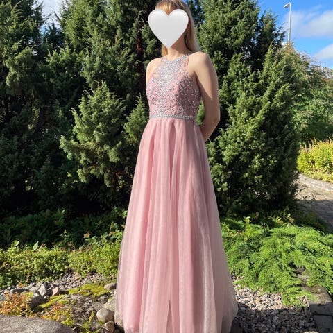 Taivaansininen olkaimeton vanhojentanssimekko, jonka yläosassa timanttikoristelu. Käytetty kuivapesulassa, mutta säilytyksessä rypistynyt.