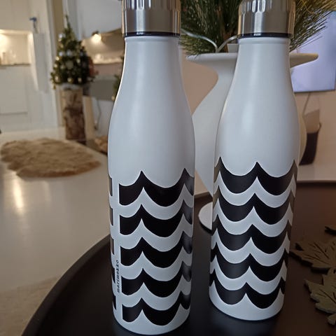 Myytävänä on Marimekon Laine-termospullo, 0,5l, musta-valkoinen, 26,5x7cm, valmistettu ruostumattomasta teräksestä. Sopii kylmille ja kuumille juomille.