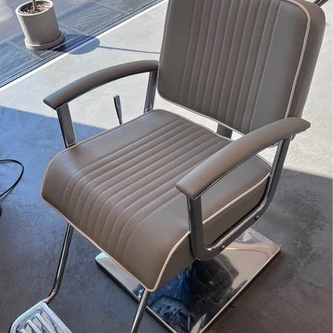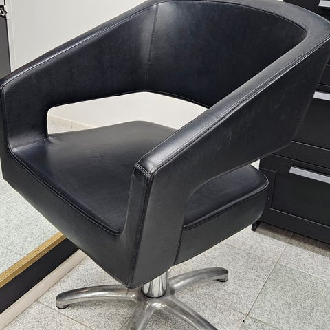 Parturituoli mustalla keinonahkaverhoilulla. Tuolissa on käsinojat ja jalkatuki sekä niskatuki. Metallinen pyöreä jalusta tarjoaa vakautta. Sopii parturi- ja kampaamokäyttöön. Pumpputoimii. Pölyt ja lakkajäämät pitää putsata.