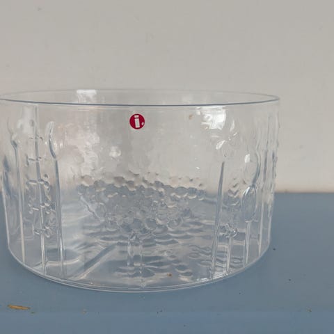 Nuutajärven lasi, Flora. Oiva Toikan suunnittelema juomalasi. Korkeus 10 cm, lasi on toisessa valossa sininen, toisessa violetti, neodyymi. 60-luvulta. Nouto Naantalista.