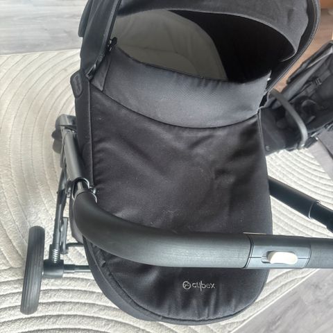 Cybex lastenvaunut tumman sinisellä kankaalla ja ruskeilla nahkaimitoilla. Vaunut sisältävät kantokopan ja istuinosan. Sopii vastasyntyneestä eteenpäin käytettäväksi. Varustettu säädettävällä kuomulla ja pyörillä, jotka soveltuvat erilaisiin maastoihin.