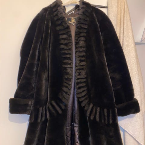 Oikein hyvässä kunnossa. Hakaskiinnitykset edessä. Mitat kai-kai 54 cm, olka-helma 105 cm.