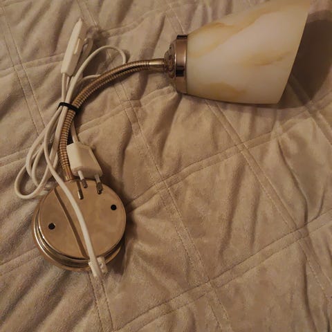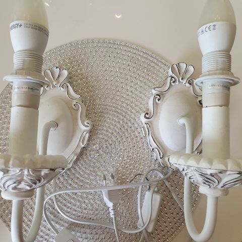 Kaksi seinävalaisinta, joissa valkoinen lasivarjostin ja kukkakuviointi. Valaisimissa on valkoinen johto ja kytkin. Sopii sisäkäyttöön, esimerkiksi makuuhuoneeseen tai käytävään.