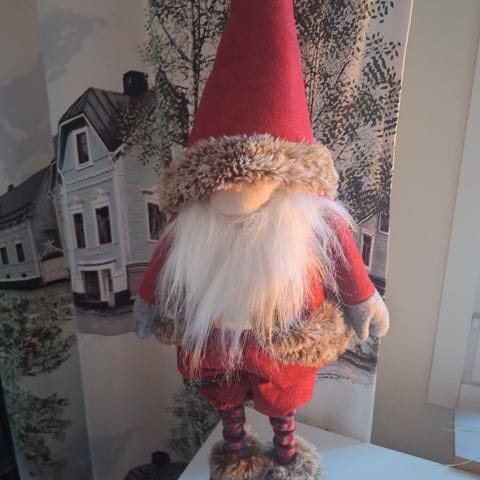 Korkeus 42 cm. Vartalo-osa täytetty jollakin hiekkaa muistuttavalla materiaalilla, joten pysyy hyvin pystyssä. Vyöllään lahjasäkki. Punaiset kintaat ja tossut. Joko nouto Atalasta, Matkahuollon pakettina 10,80€ tai Toridiili.
