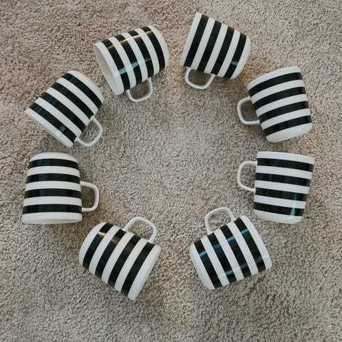 Myydään pakettina. Tiiliskivi-mukit uudet (ei ole tarroja), siirtolapuutarha-mukeissa kultauksissa hieman jälkiä.
