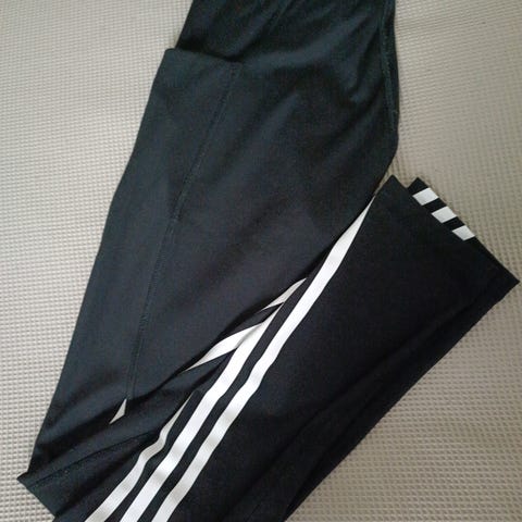 Naisten urheilulegginsit, Adidas, Koko M. Polyesteri, elastaani. Sivuissa raidat. Ehjät ja siistit. Postitus tai nouto.