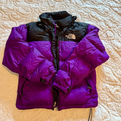 The north face puffer, koko nuorten XL, vastaa kokoa naisten XS-S. Toisessa hihassa paikka (näkyy vikassa kuvassa), muuten hyvässä kunnossa. Noin 160cm pituiselle juuri sopiva.