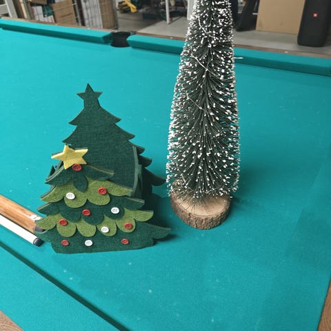 Oksilla joulukoristeita liimattuna.