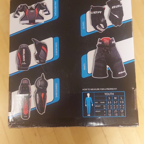 Sopii noin 5-6 vuotiaalle. Polvisuojat, jääkiekkohousut, kyynärsuojat, alasuoja, jääkiekkohanskat ja hartiasuoja.