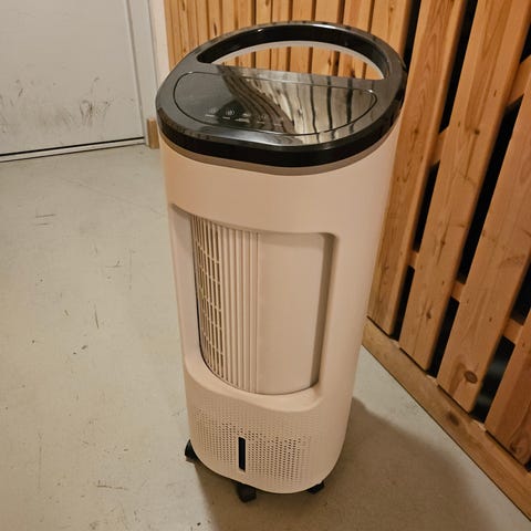 Siirrettävä ilmanviilennin, viilentää ilmaa vedellä ja jääpaloilla/kylmäkallella. Mukana kaukosäädin. Ovh Motonetissa 60€.